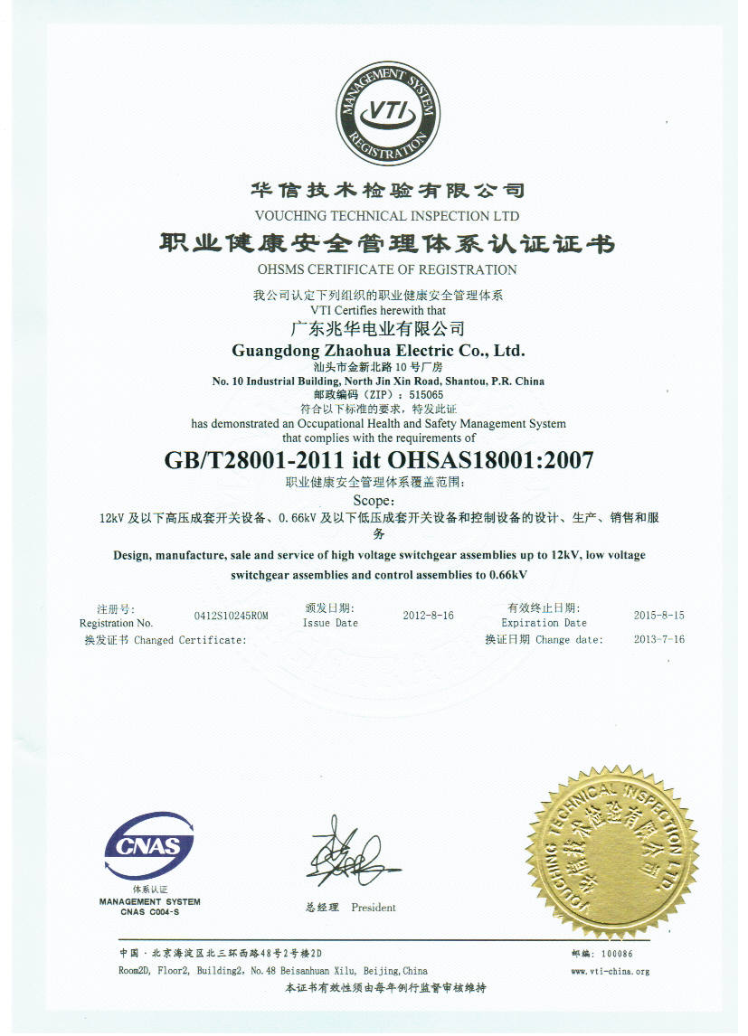 职业健康安全管理体系认证证书