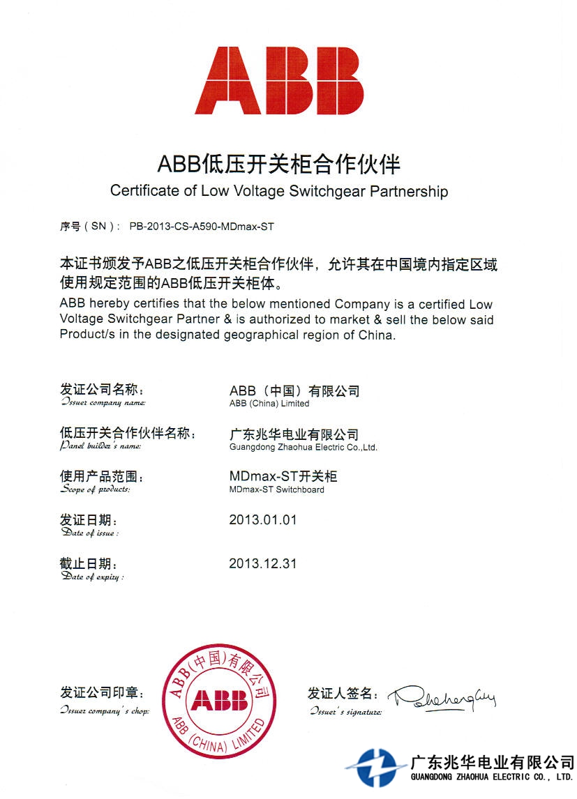 > 图片: ABB公司MD max-ST开关柜授权生产证书