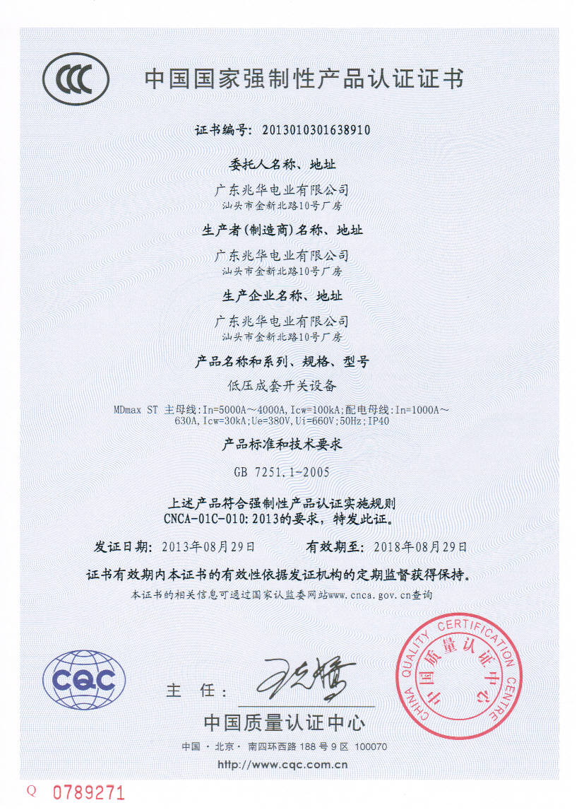 > 图片: 中国国家强制性产品认证证书(MDmax ST低压成套开关设备)